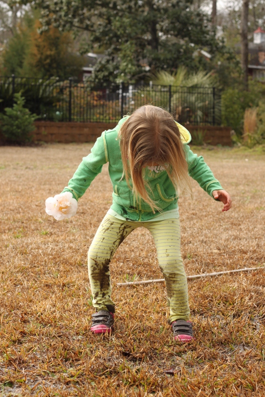 The weather has been consistently in the 50's-60's. The few days after we were all feeling better it was raining quite a bit. We all know rain makes puddles, and puddles produce mud. Brayden is drawn to anything that makes him dirty. He had a blast, and even our little Leah got involved. I had to dart inside to find my camera to get a few fun pictures.
